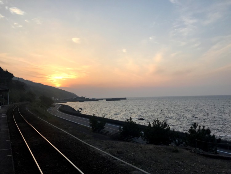 奇跡的にちょうどのタイミングで、伊予灘ものがたり(JR四国の観光列車)が通り、