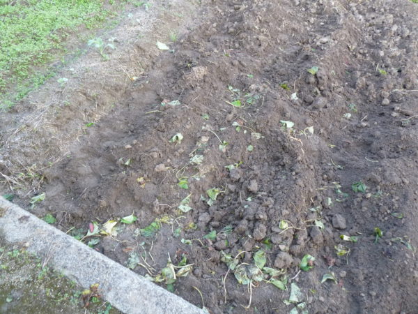 うちの裏庭で育てていたサツマイモが先日、2晩続けてイノシシにやられてしまいました。11月に入ったら収穫しようと、家族で楽しみにしていました。最近、近所の畑や家庭菜園でのイノシシ被害のウワサも聞いており、忌避剤や赤外線センサーの点滅ライト、丈夫なネットで覆って用心してはいたのですが、残念ながら効き目がありませんでした。足跡から小さいウリ坊と思われ、門扉や垣根の下をくぐって侵入した模様です。写真のように、休日に茎や葉っぱの残骸を取り除き、気休めに何本か残っていないか掘り起こしてみましたが1本も残っておらず、見事に全滅です。隣の畝のブロッコリーの苗や春菊、大根には目もくれず、幸い踏み荒らされてもいなかったのでそれらの収穫を楽しみにします。