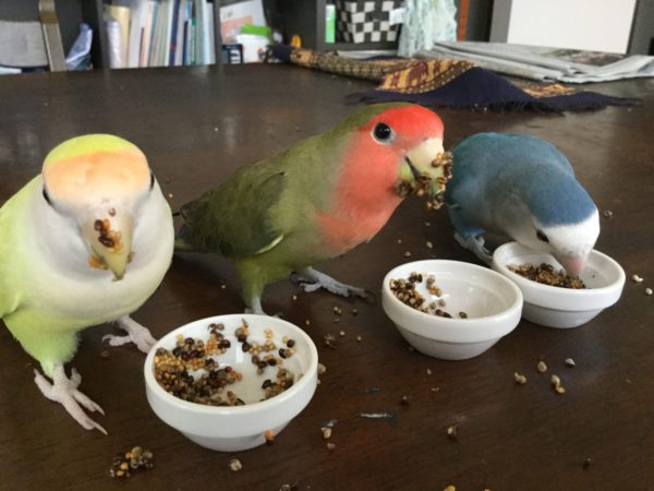この写真は放鳥中のご褒美タイム。キイちゃん・なっちゃん食べ方汚い~!