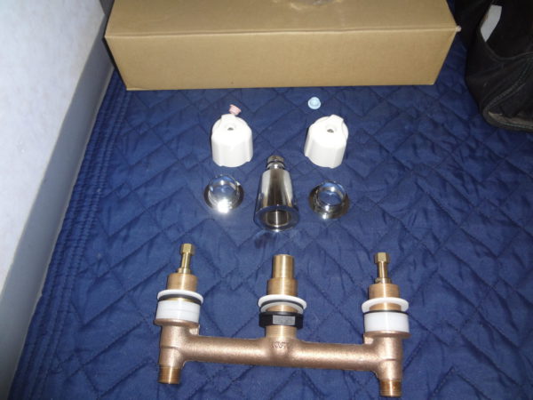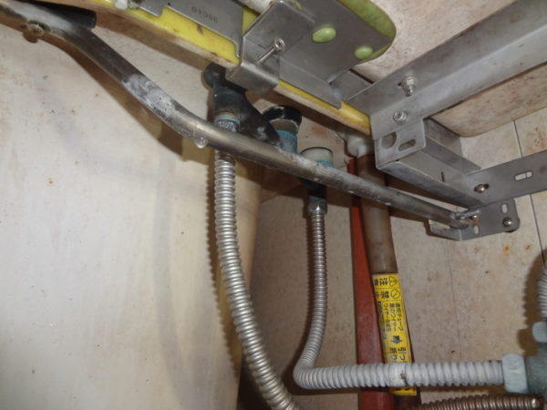 混合栓を取り付ける準備中、バラした所です、本体を浴槽の下から差し入れ上から挟み込んで締めて固定していきます。