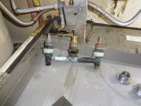 これが取りはずした混合栓ですよ~。青く見える所は水漏れなどの後ですね~。