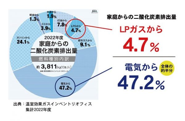 電気は家庭での使用時に二酸化炭素は排出しませんが、そのエネルギーをつくるために火力発電では、LPガスと比較して3倍以上の二酸化炭素を排出しています。