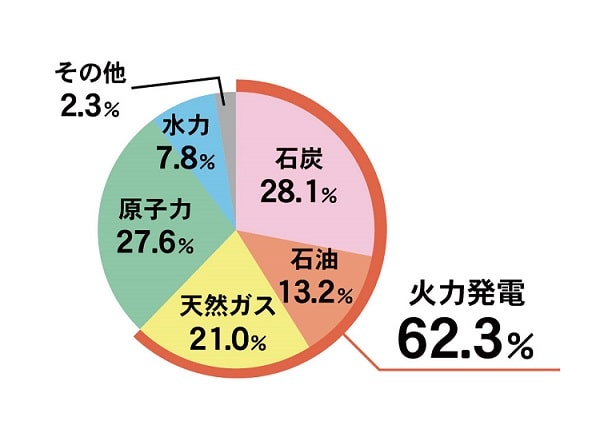 毎日使う「電気」は、電気を生む発電所で二酸化炭素を排出しています。そのうえ電気は発電や送電時には約65%もロスされ家庭に届くまでの間に、じつに送られた総エネルギーの35%にまで減少しています。
