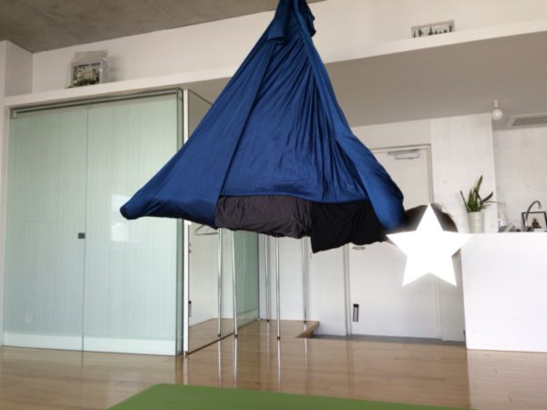 エアリアルヨガはハンモックを使ったヨガで、いつもより体が伸びます。