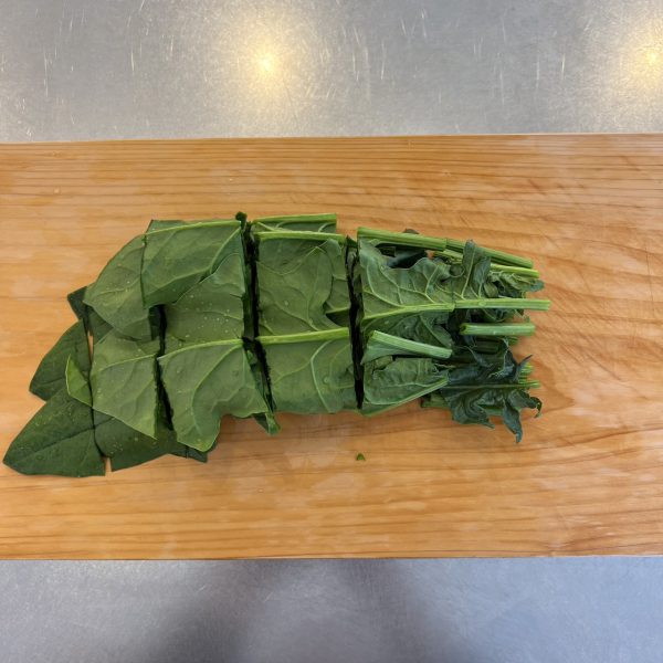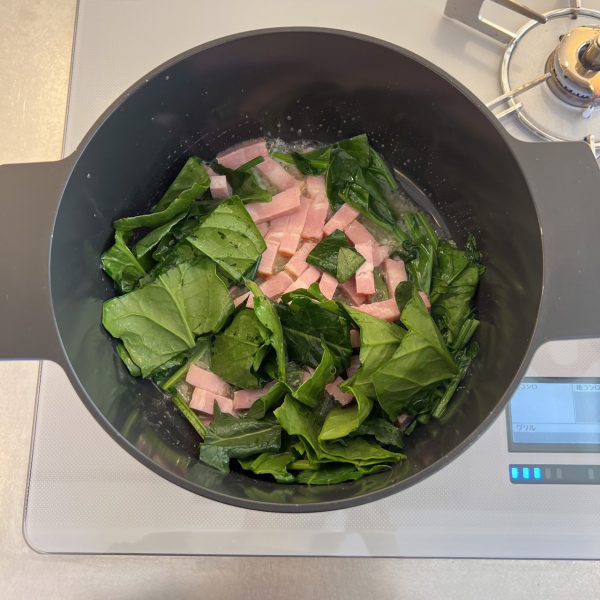 ②鍋にバター、ほうれん草、ベーコンを入れて中火で熱し、ほうれん草がしんなりするまで炒める。火を止めてから薄力粉をふるい入れ、ゴムベラでよく混ぜる。