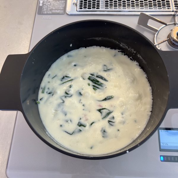 ④ 牛乳、水を加え、コンソメと塩こしょうで味を調える。