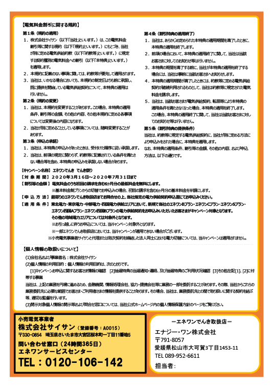 キャンペーン詳細については、下記のチラシをご覧くださいませ。(最低料金については、エネワンでんきの料金表をご参照ください)