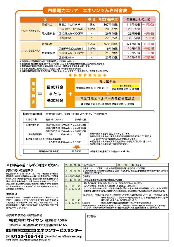 エネワンでんき「でんき祭り」キャンペーンチラシ2エネワンでんき電気料金表