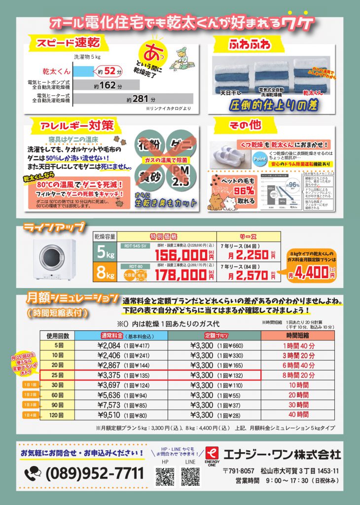 【お知らせ】電化住宅限定★ガス衣類乾燥機、乾太くんガス料金月額定額プラン