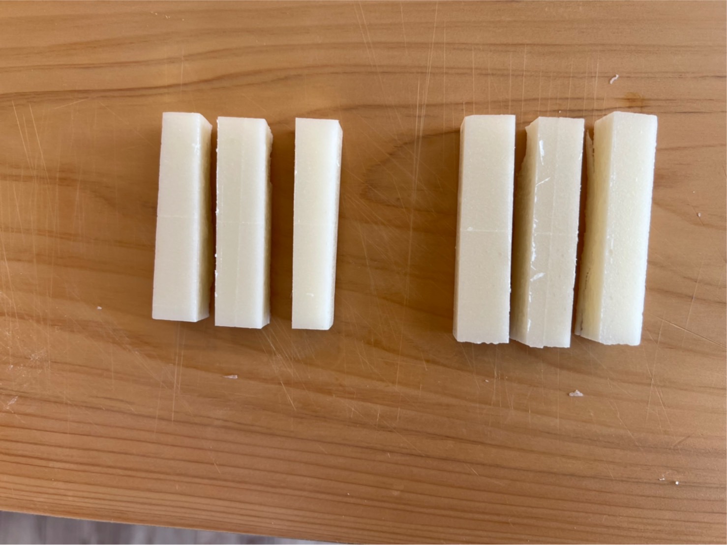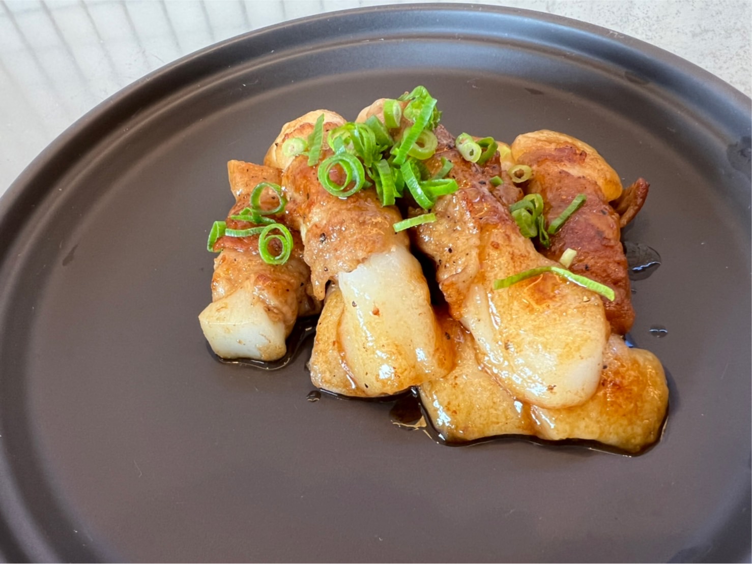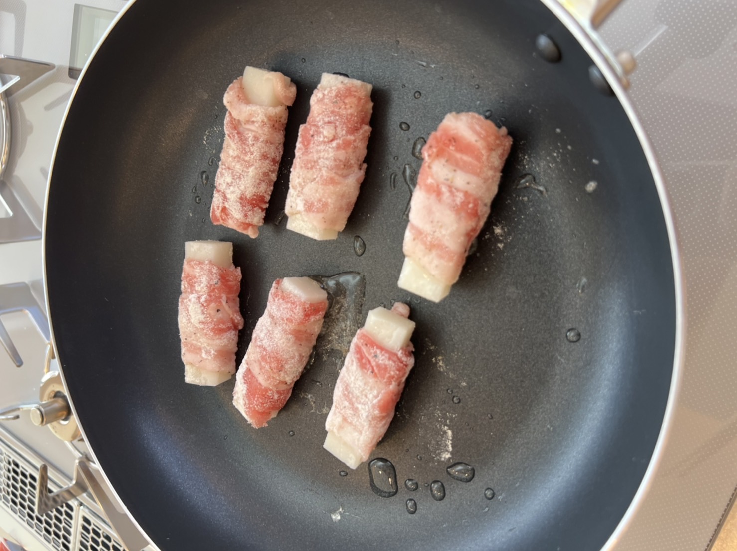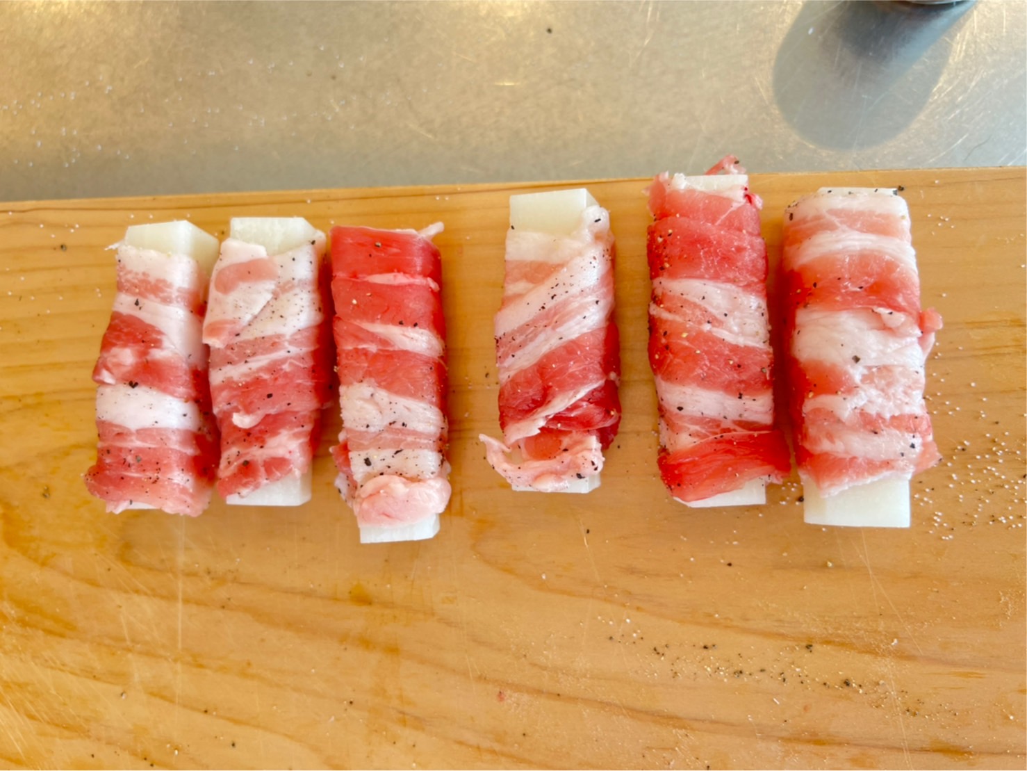 ②豚肉に塩コショウをふり、もちを乗せて巻き、全体に薄力粉をまぶす。
