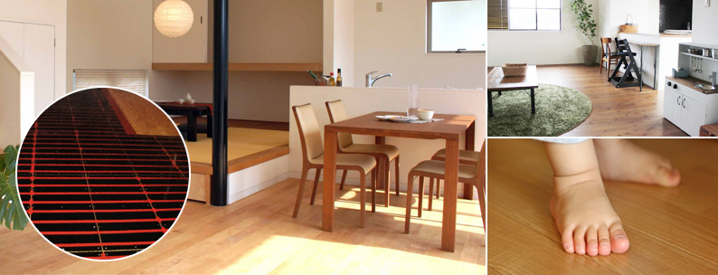 足元から空間全体を暖める、遠赤外線輻射熱の床暖房システム。エアコン暖房のように天井付近ばかりが暖まり、足元はひんやりということはありません。自由設計で間取りに合せて敷設することができます。継ぎ手を使用しない「ジョイントレス」工法を採用しているので、床の湾曲や水漏れの心配もありません。